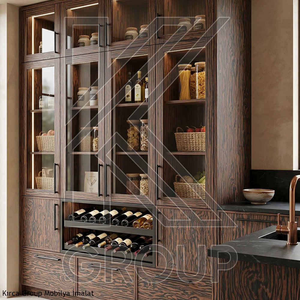 Modern Tasarım Detayları: Abanoz kaplama kiler dolaplarını siyah mat kulplar, antrasit iç gövdeler ve temperli cam kapaklarla kombinleyerek endüstriyel-modern veya lüks-klasik bir stil elde edebilirsiniz. Özellikle dolap içi LED aydınlatmalar, abanozun koyu damarlarını ön plana çıkararak gece kullanımlarında şık bir atmosfer sunar.